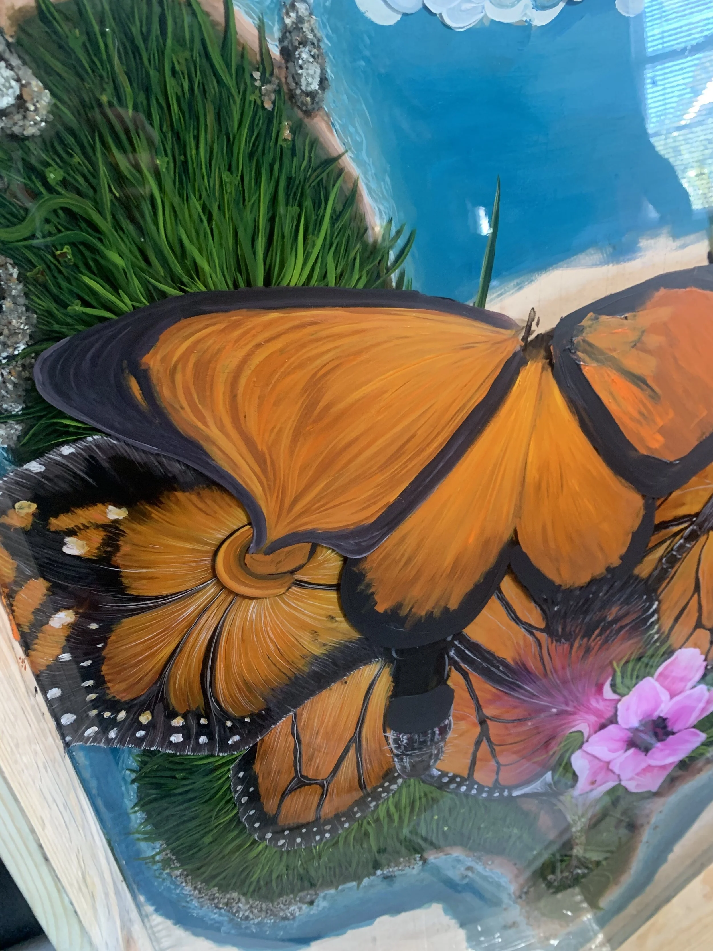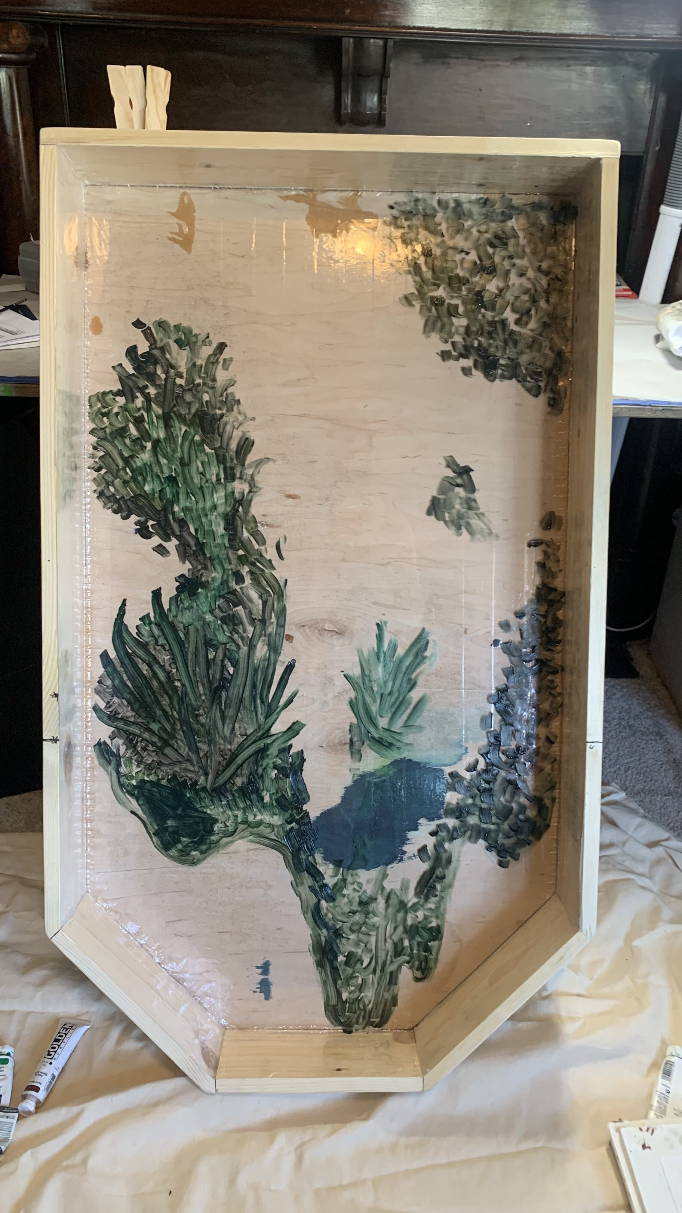 After waiting 8 hours for the resin to cure I was able to start painting on the 1st layer of resin. My inspiration for the painting deviated a lot from what I initially thought I would paint. I ended up going with a theme of interconnectedness of life through creation and the multitudes of existence. I began the painting by putting down a layer of tall grass