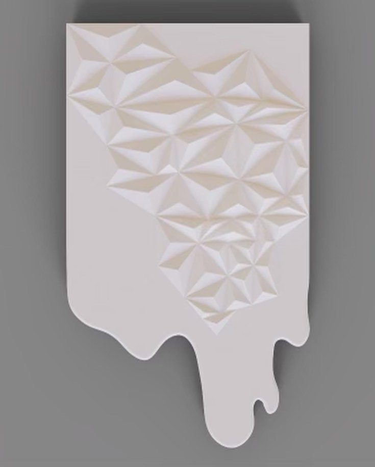 For the sculpting part of this project to take place I had to get a 3d model of my idea designed on a computer software. I am not very knowledgeable on this and honestly didn’t have the time to learn because I was too busy painting the piece, so I hired a freelancer on from Serbia and got him to make the model. His name was Goran, and he helped me change up the design a bit too because originally the entire piece was going to be covered in the geometric pyramids, but Goran said I should let some of the painting not be covered by the pyramids and that ended up being a great idea. So we went with this design 1st.